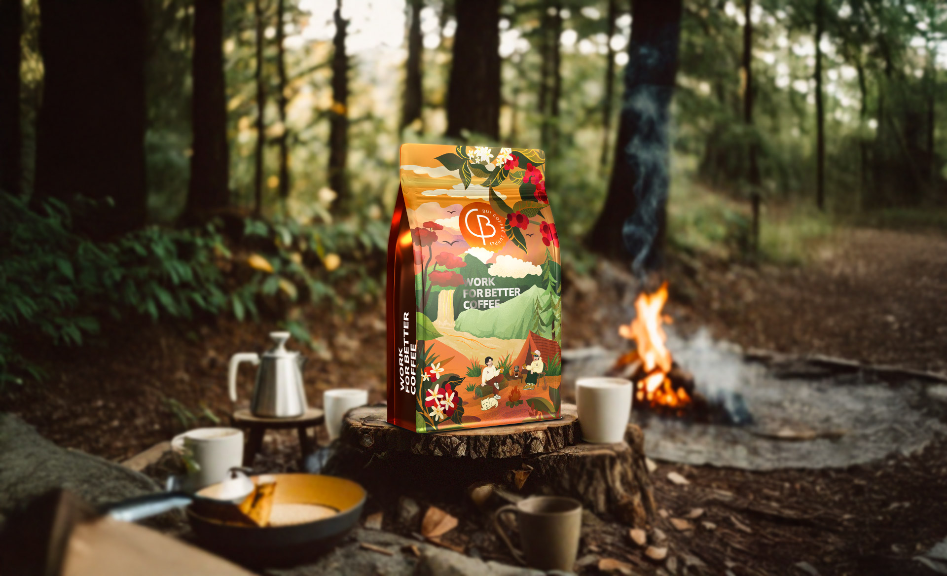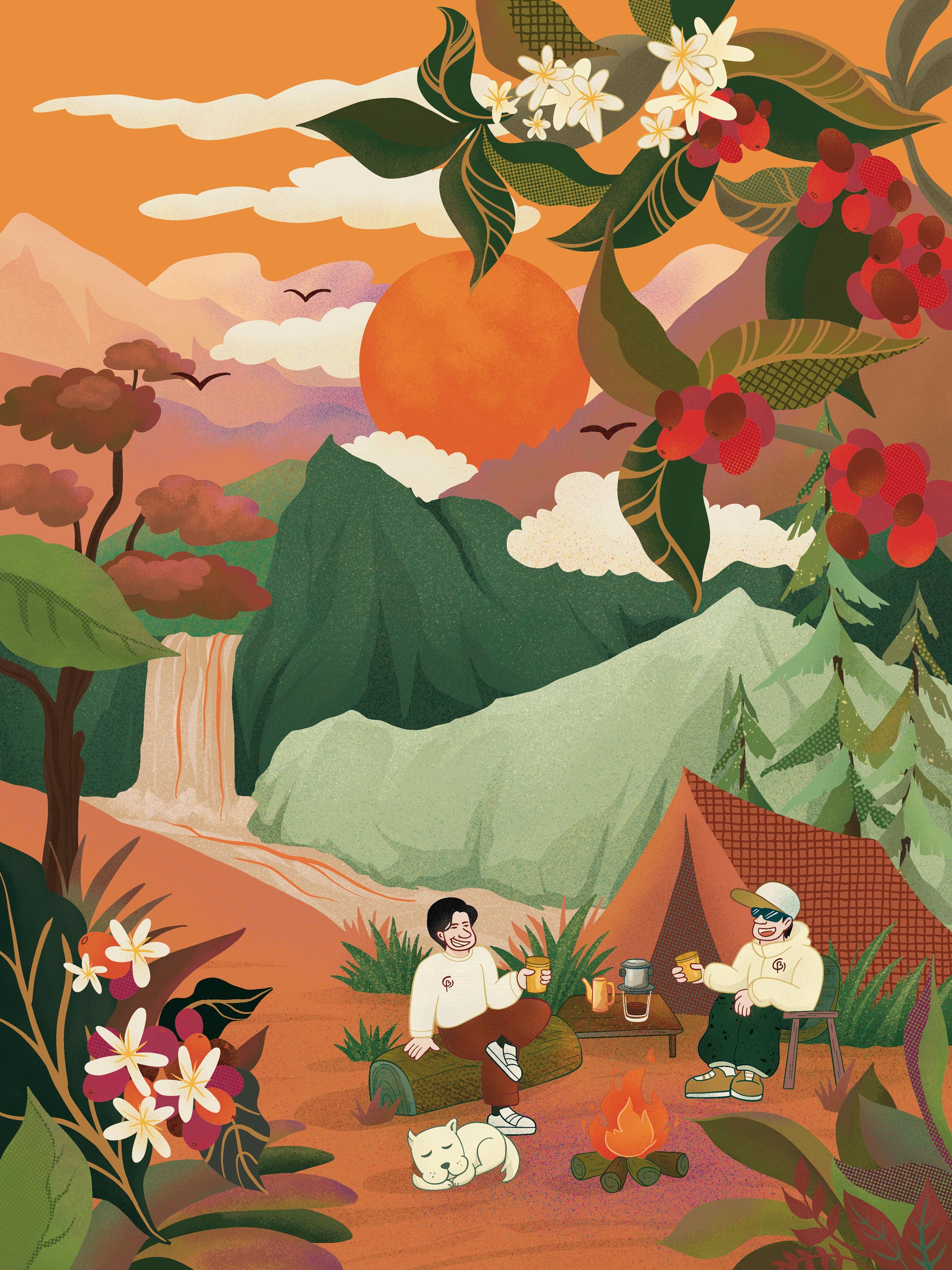 First, we built the story visually. A custom illustration captured Lam Dong’s highlands — coffee blossoms, ripe cherries, rolling mountains, and the founder enjoying a slow brew by the campfire. This instantly transports customers to the brand’s origin.