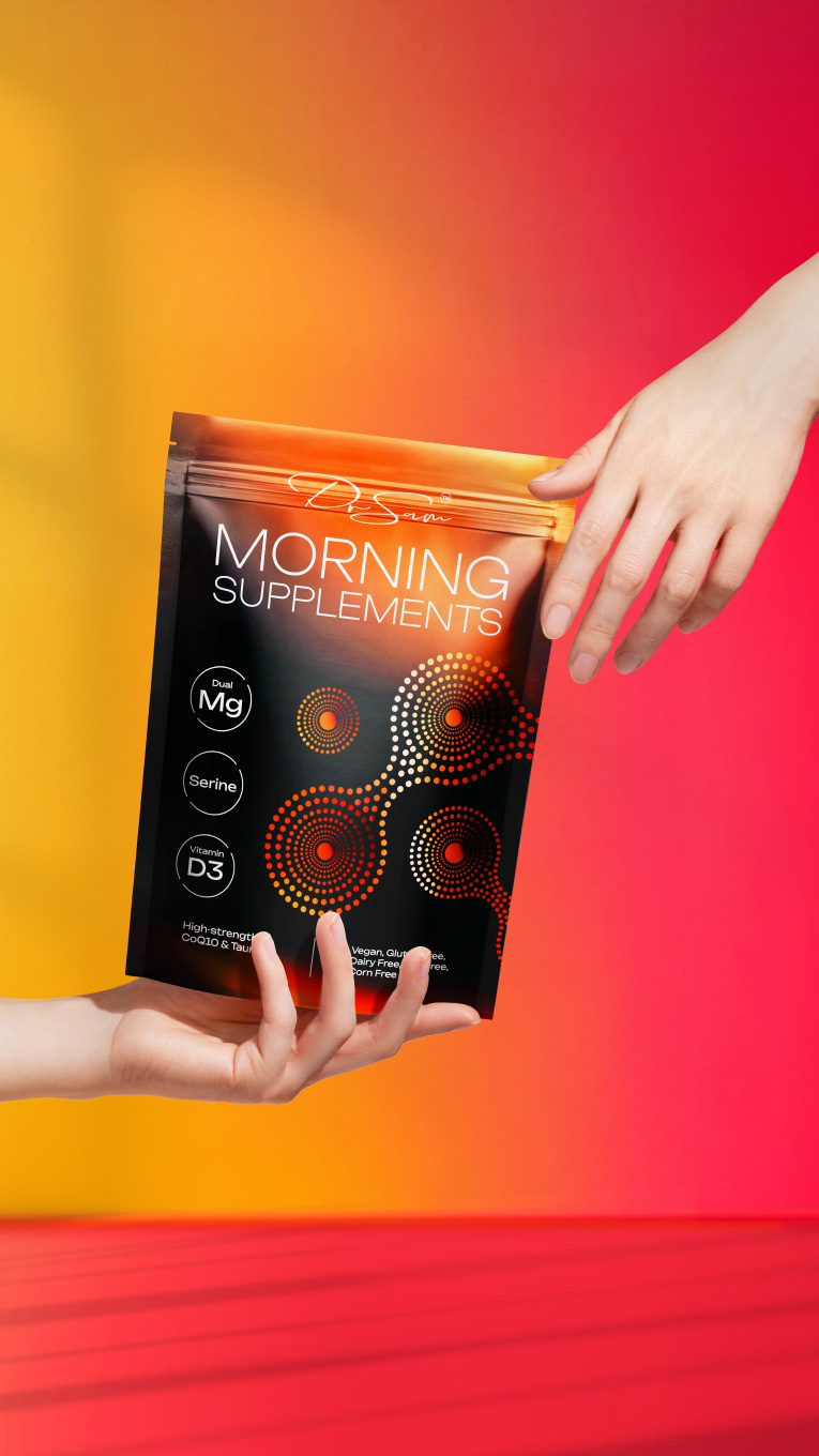Rather than chasing trends, we built a design system rooted in meaning. To begin with, black became the foundation—commanding and sophisticated, allowing product callouts to shine. Next, we developed a custom pattern using Indigenous dot art, honouring Dr Sam’s cultural heritage while subtly referencing cellular biology and biochemical pathways. Additionally, two colour variations—orange for day, blue for night—distinguished the Morning and Evening blends, creating an intuitive visual system.